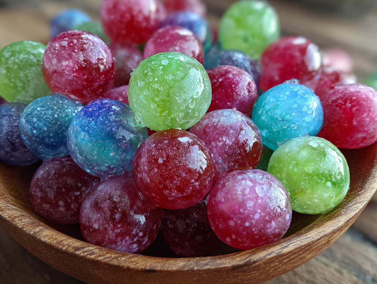 - Dip grapes: Working quickly, dip each grape into one colored syrup (use forks or skewers), letting excess drip off. Place on parchment. Repeat, mixing colors for galaxy effect.