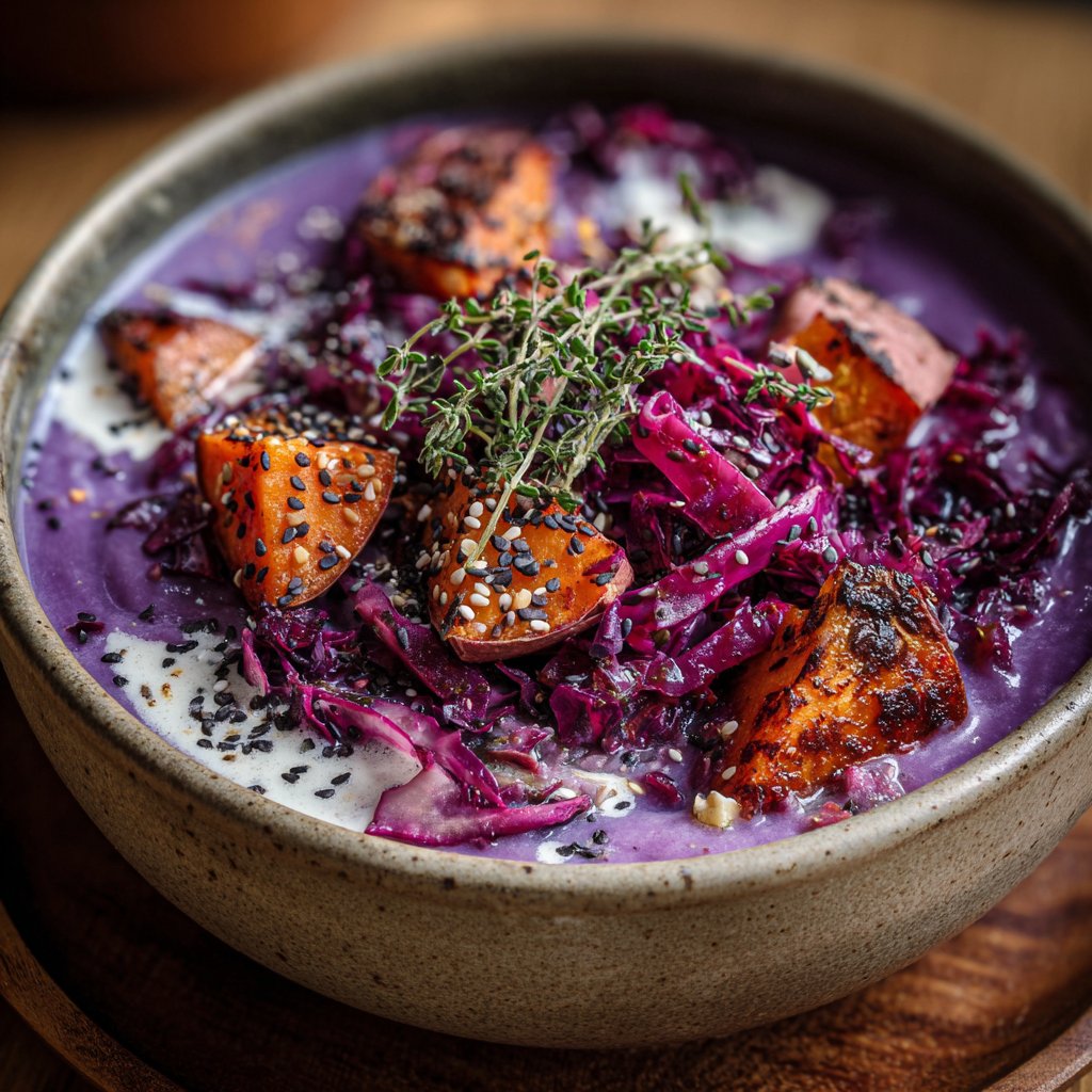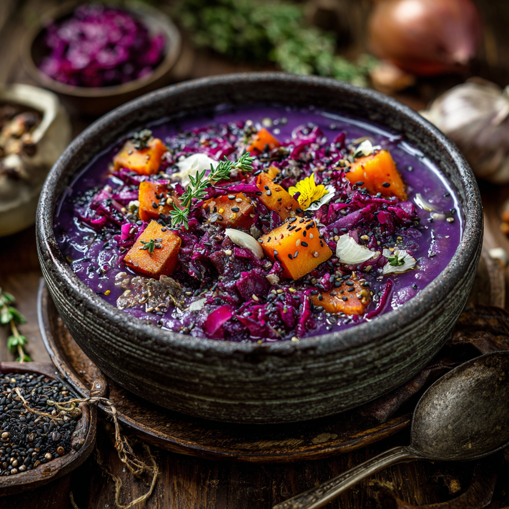 - Add cubed purple sweet potatoes, shredded red cabbage, vegetable broth, salt, and black pepper to the pot. Bring to a boil, then reduce heat and simmer for 20-25 minutes until sweet potatoes are very tender.